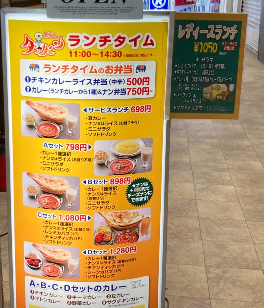 注目すべきはランチタイムの価格のリーズナブルさ。カレーとナンorライス、ミニサラダ、ドリンクがついたAセットは798円です。
