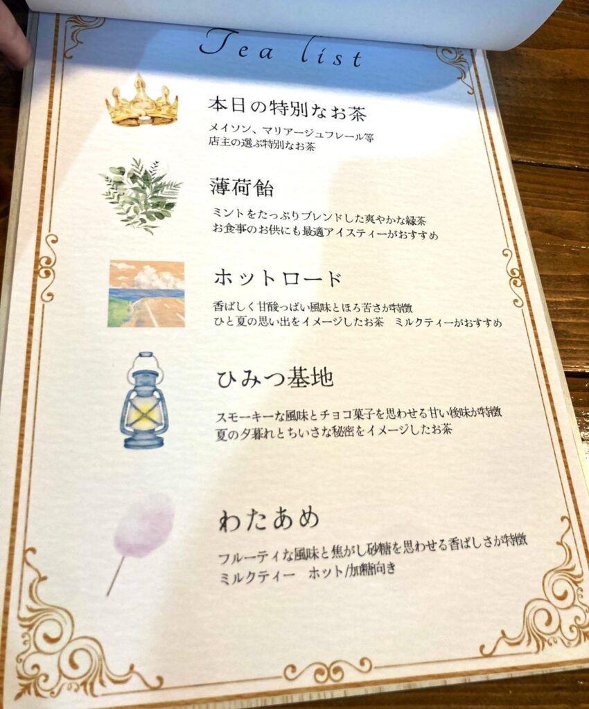ドリンクメニューと、可愛らしいラインナップのフレーバーティー。