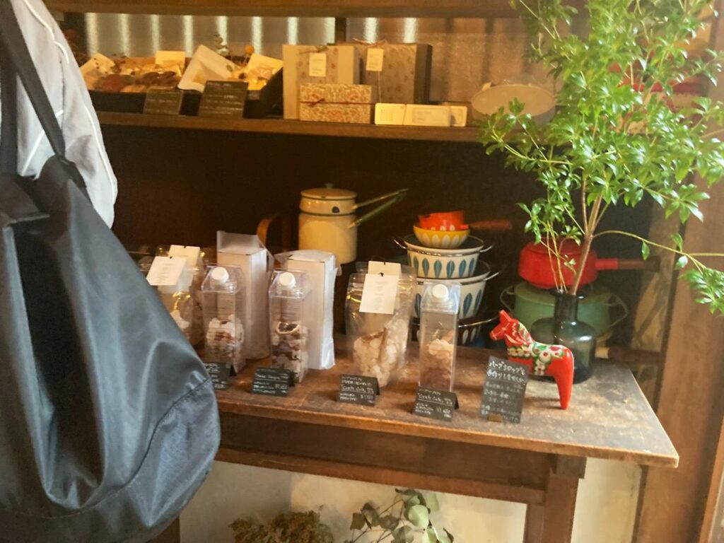 入口付近には自然栽培のお茶やハーブなどが並び、奥のレジ横にはお菓子が並びます。個包装の焼き菓子類は自分で手に取りかごに入れて、タルトやキッシュなどは店員さんに希望を伝えるシステムです。