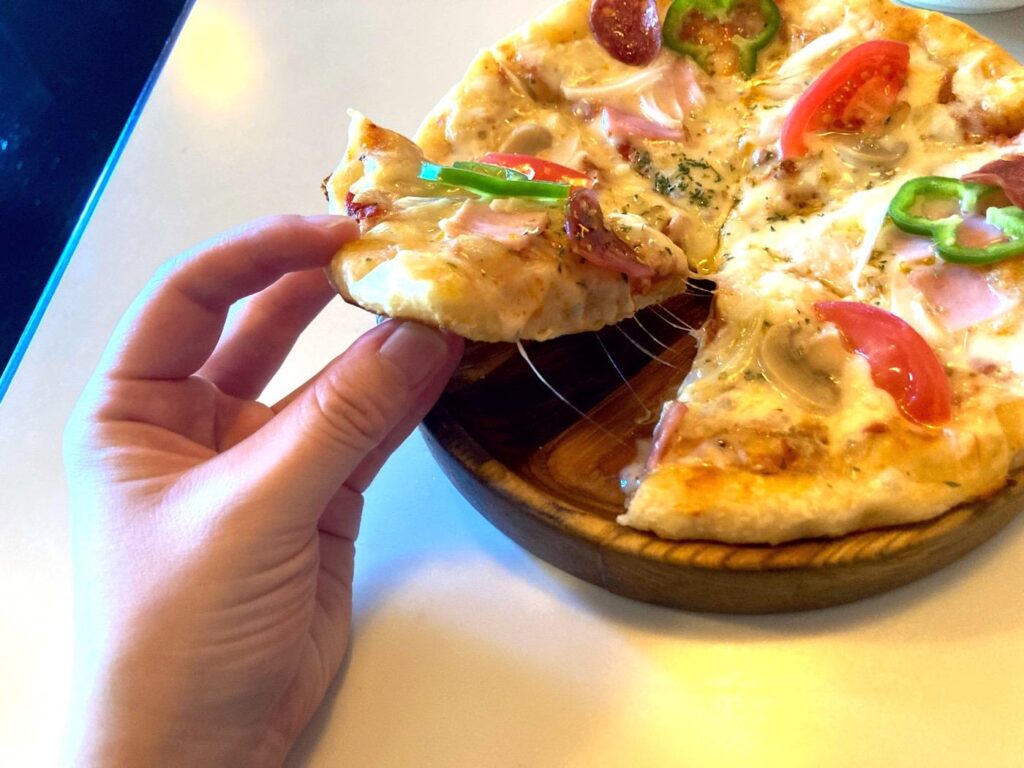 ピザの直径は小ぶりですが、厚さがありボリュームたっぷりです。片手で持ちやすく、パクッと食べやすいところも最高です。