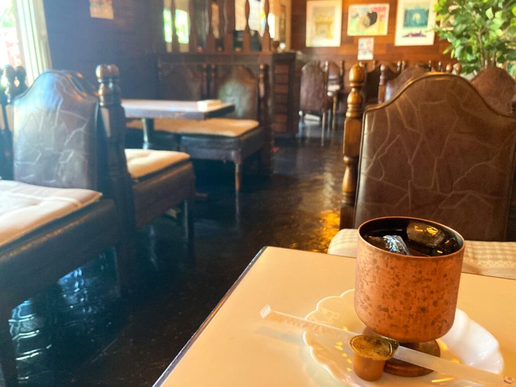 しばらくして運ばれてくるアイスコーヒー。キンキンに冷えた銅製のグラスがいいですね。
