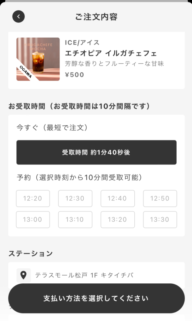 最短受け取り時間が表示されます。この時は約2分後でした。早すぎ。