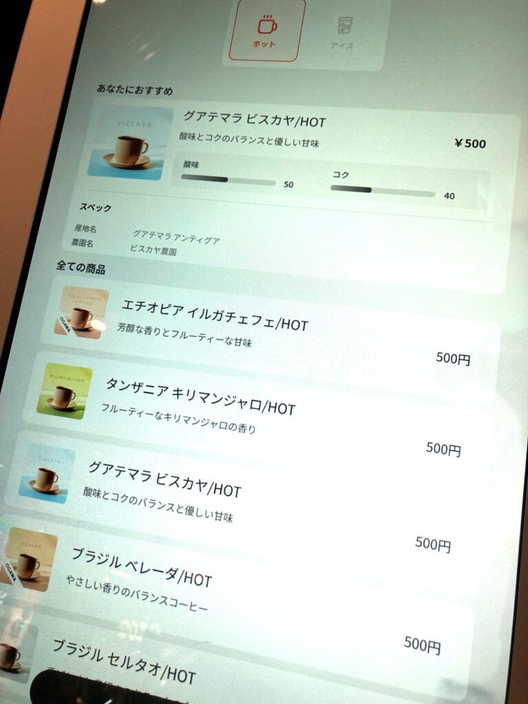 思ったより種類豊富ですね。デカフェもありました。どれも1杯500円のようです。