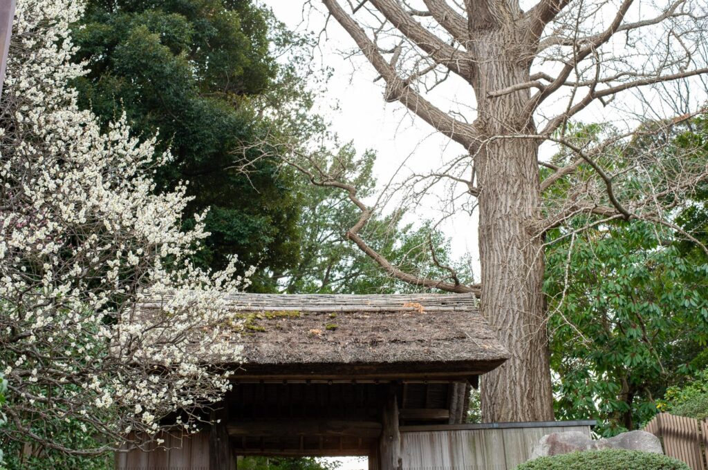 続いて敷地内に入る前、茅葺門の前には白梅が見られます。