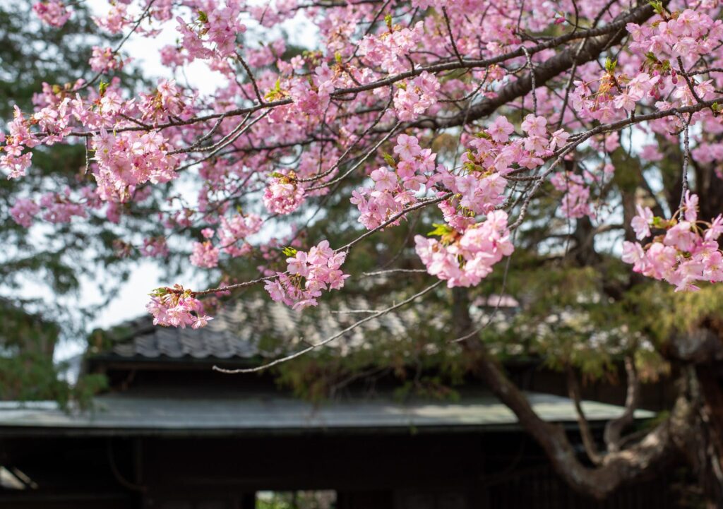 茅葺門をくぐり抜ぬけて梅園に向かう途中、戸定邸玄関前の河津桜もちょうど綺麗に咲いているので、あわせて楽しんでください。