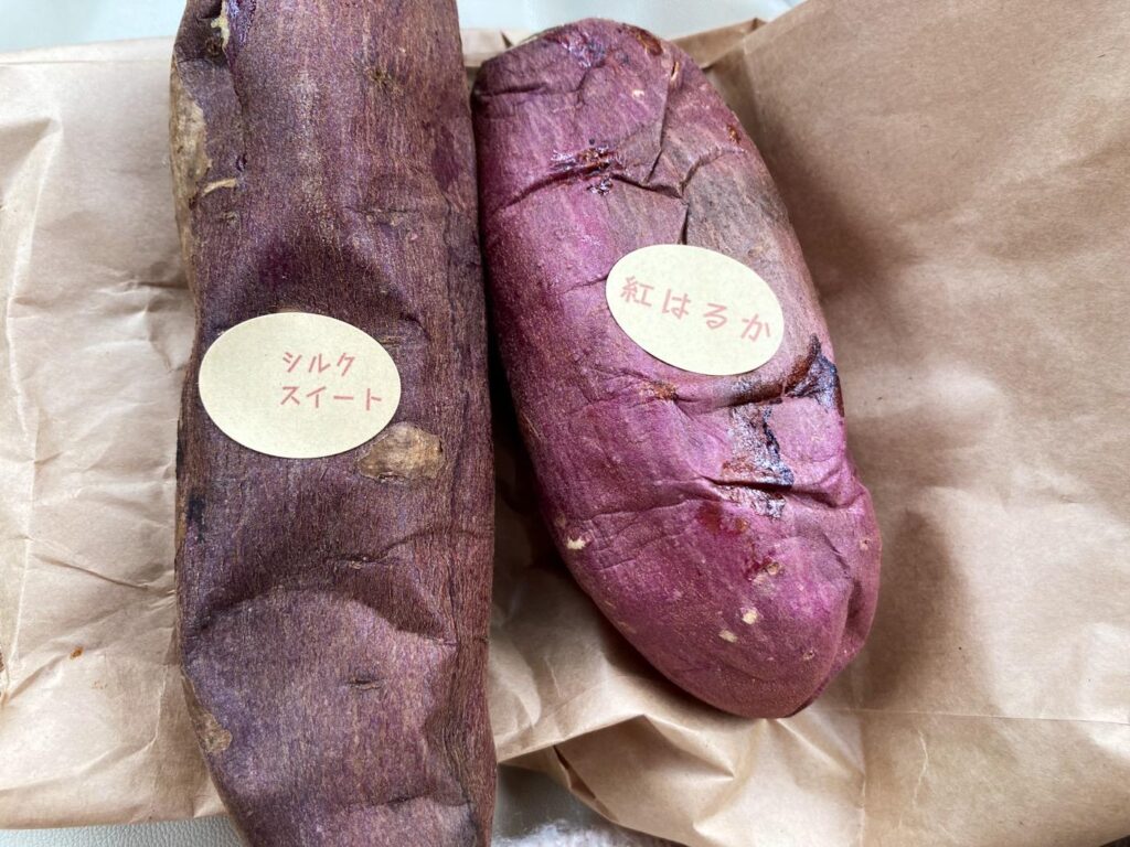 『紅はるか』と『シルクスイート』を購入しました。紙袋から香ばしく甘い香りがにじみ出てきて、今すぐにでもかぶりつきたくなります。