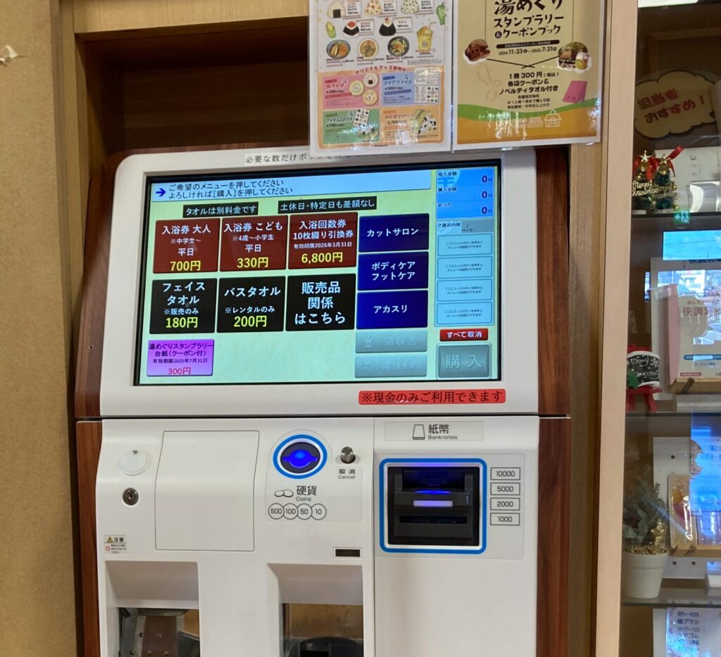 下足ロッカー、脱衣ロッカー、貴重品ロッカーに100円(返却式)が必要なのと、入浴料や食事の注文はすべて現金のみなので、用意していきましょう。