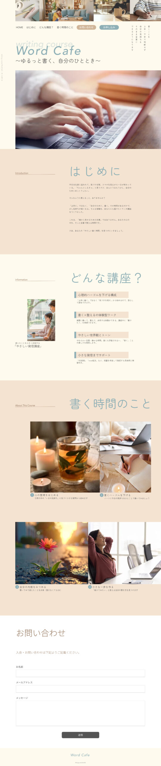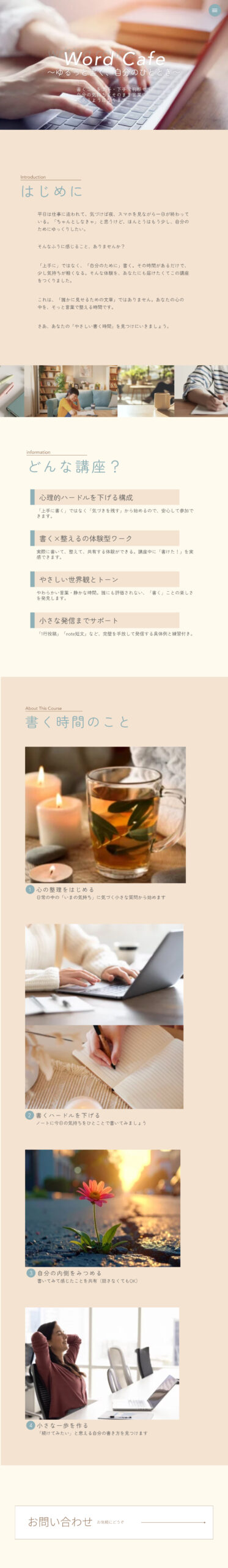「上手に書く」より「自分のために書く」世界観を表現するため、柔らかい色味と余白を活かしたデザインに。心理的負担を感じさせない導線と、カフェのようにほっとできるトーンで構成。「やってみたい」と一歩踏み出せるよう、温度感のある言葉選びと自然な申し込み導線を意識しています。